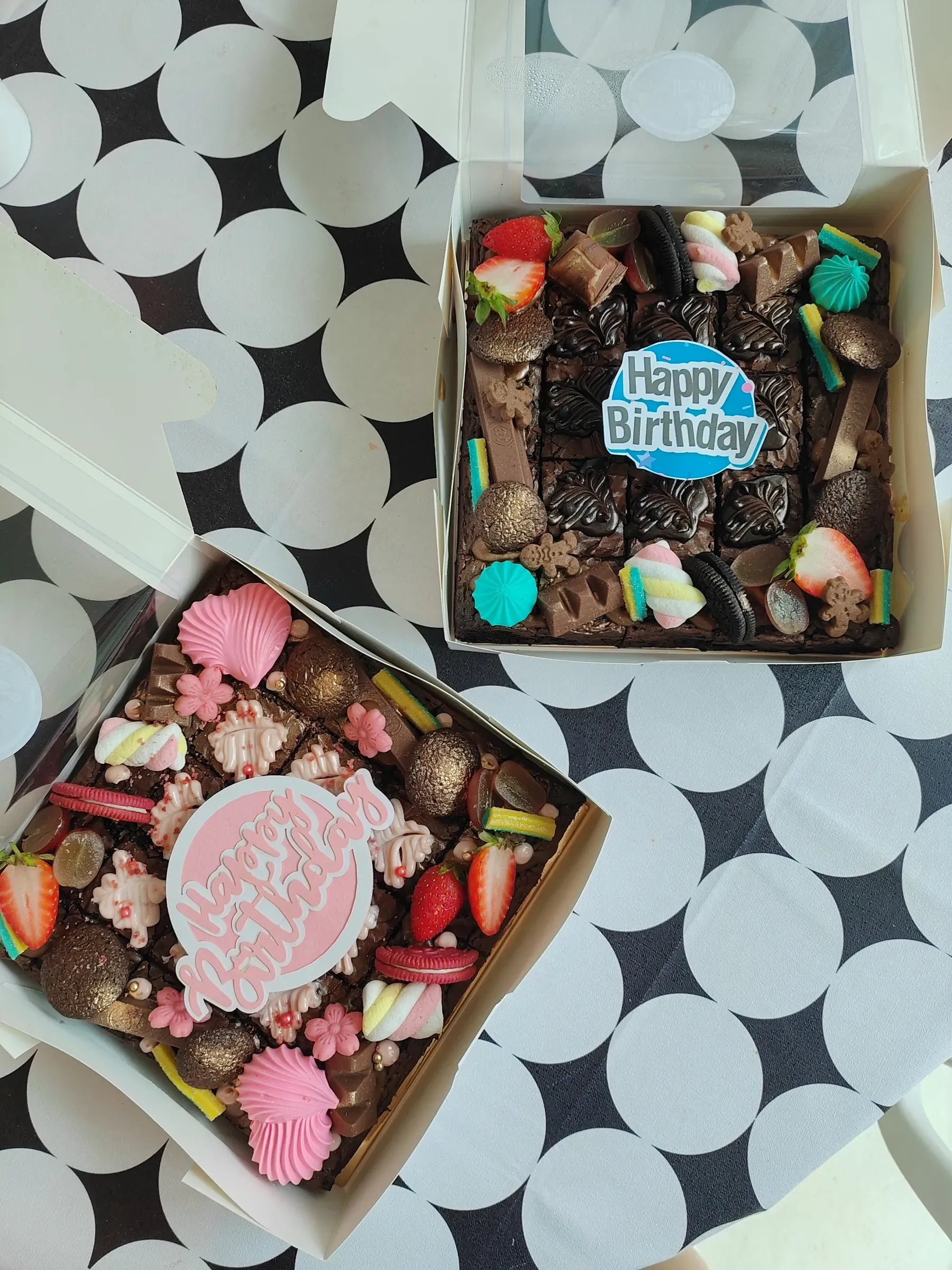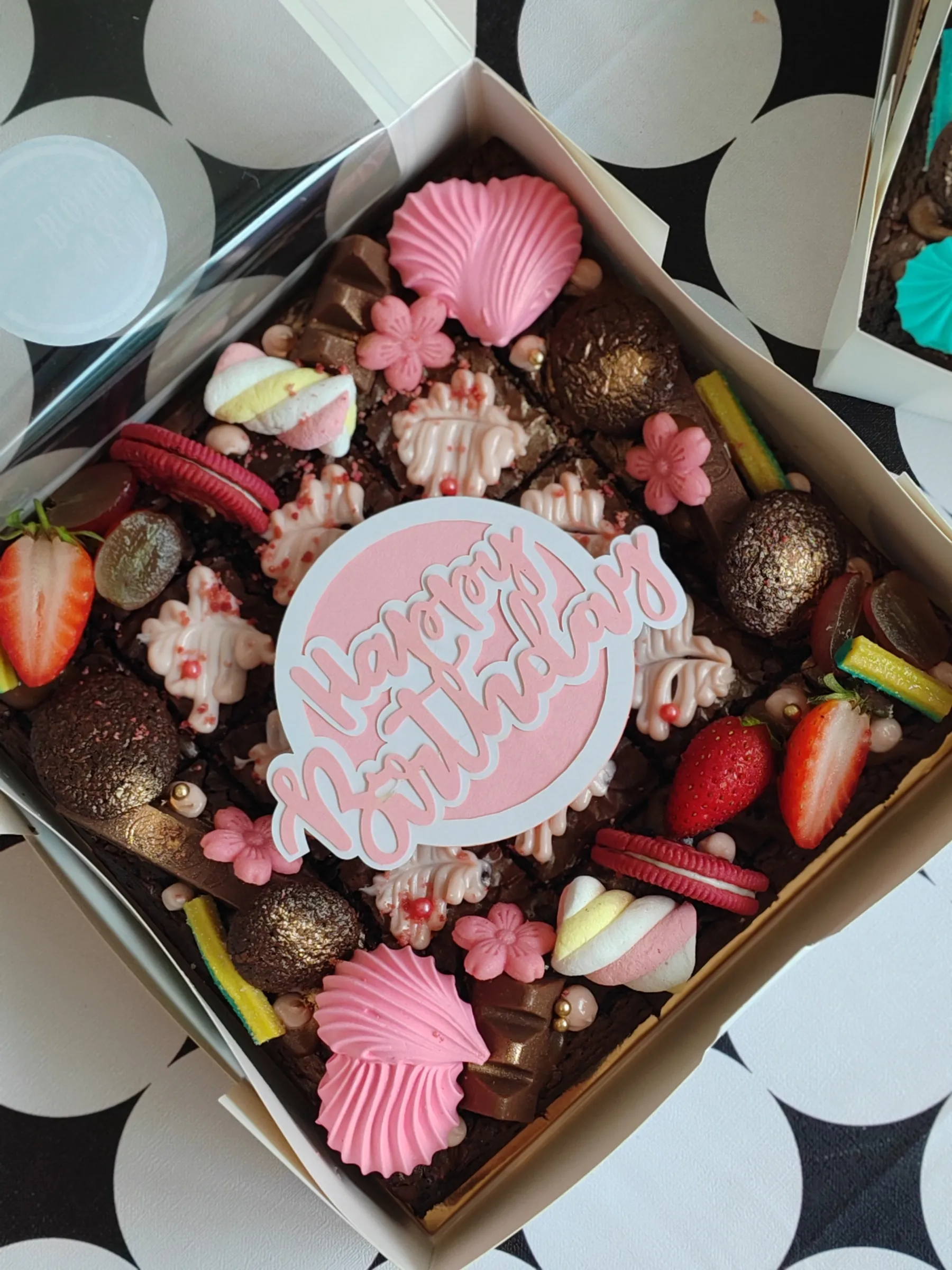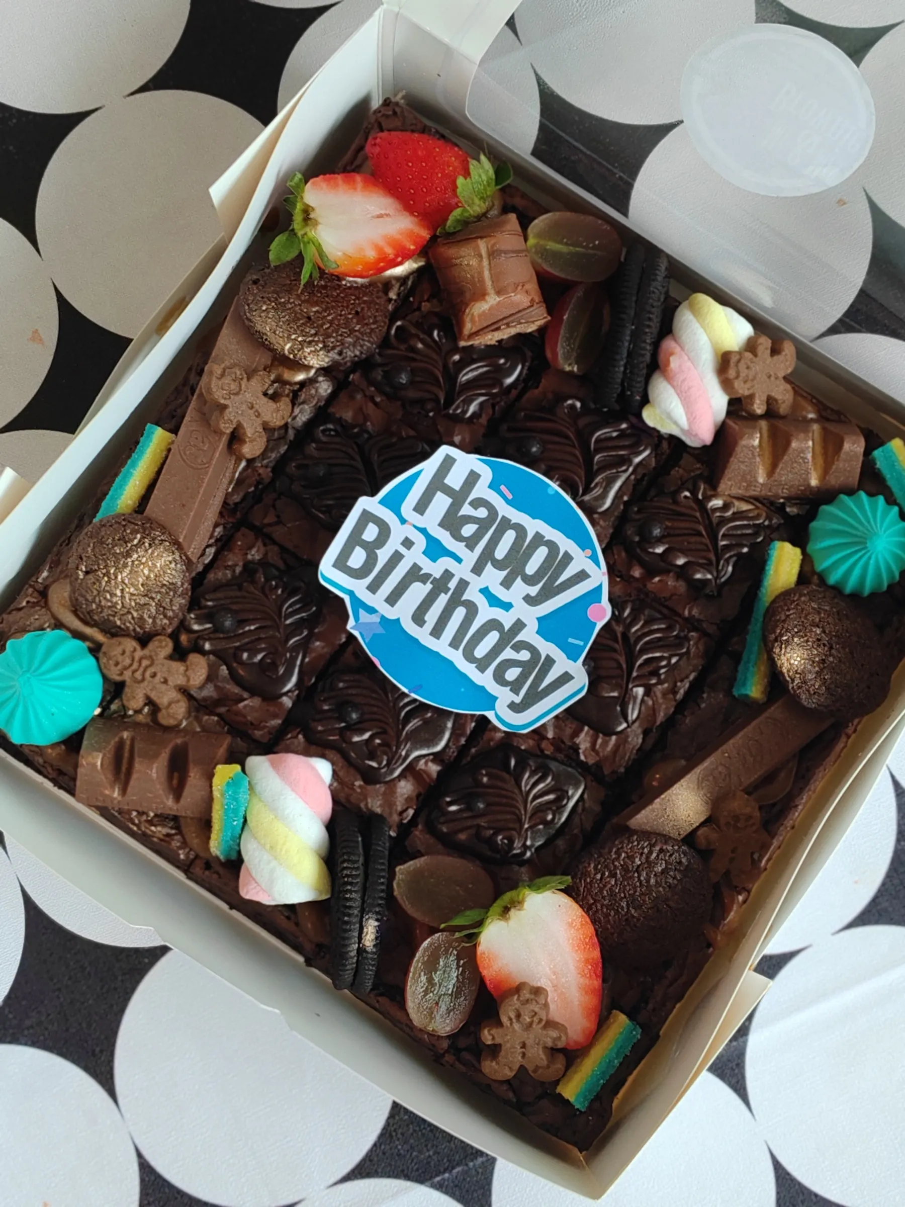 the brownie covered by assorted snacks like chocolate, kitkat, cranberries, walnut and almond. provided a birthday topper on top o the brownie.