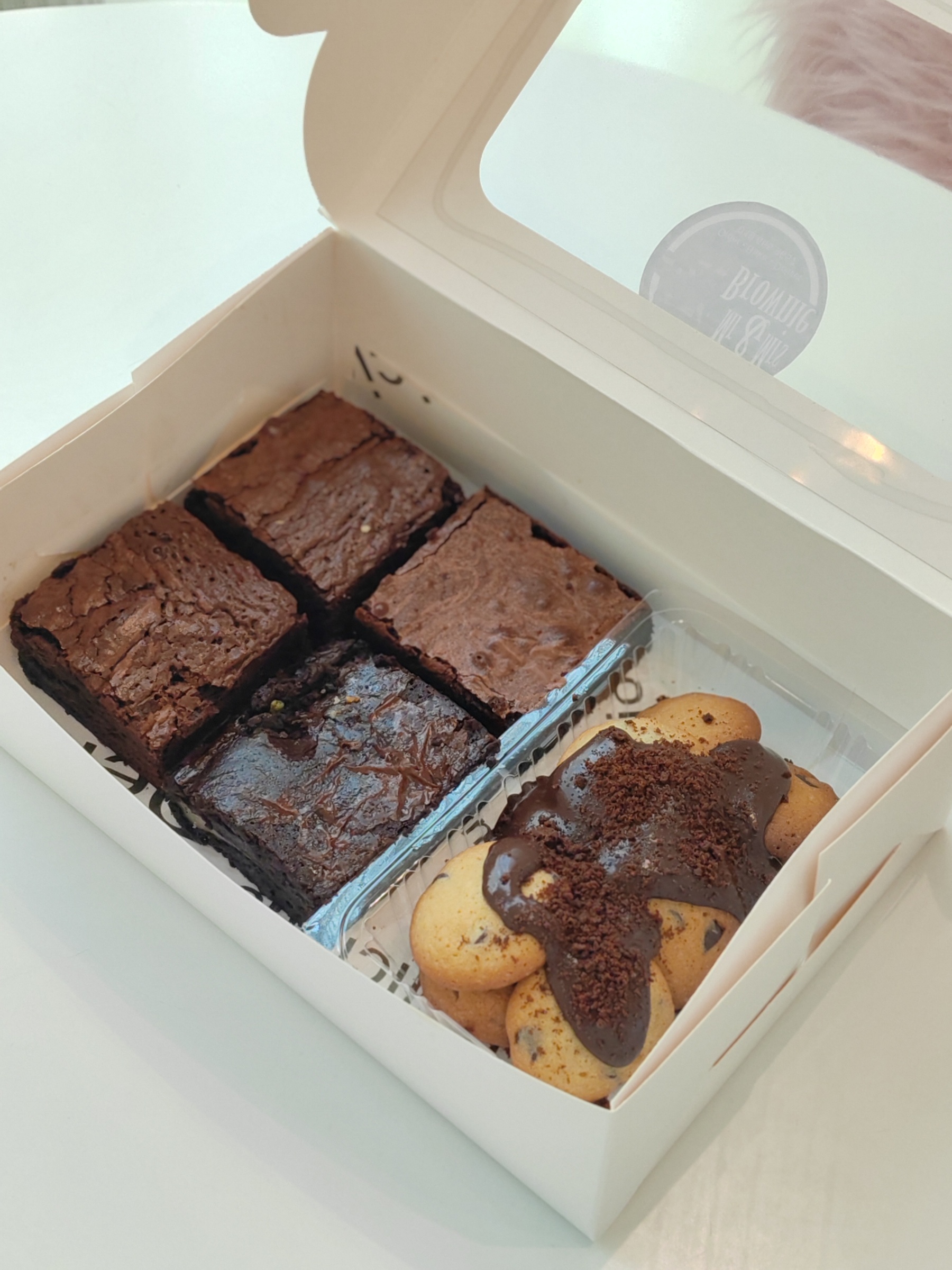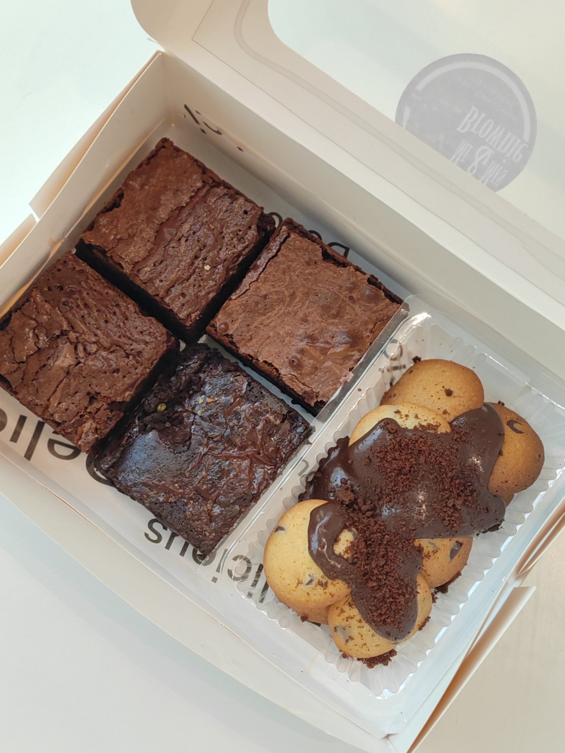 Indulge in pure chocolate bliss with our newest creation – a **decadent brownie box** featuring:
