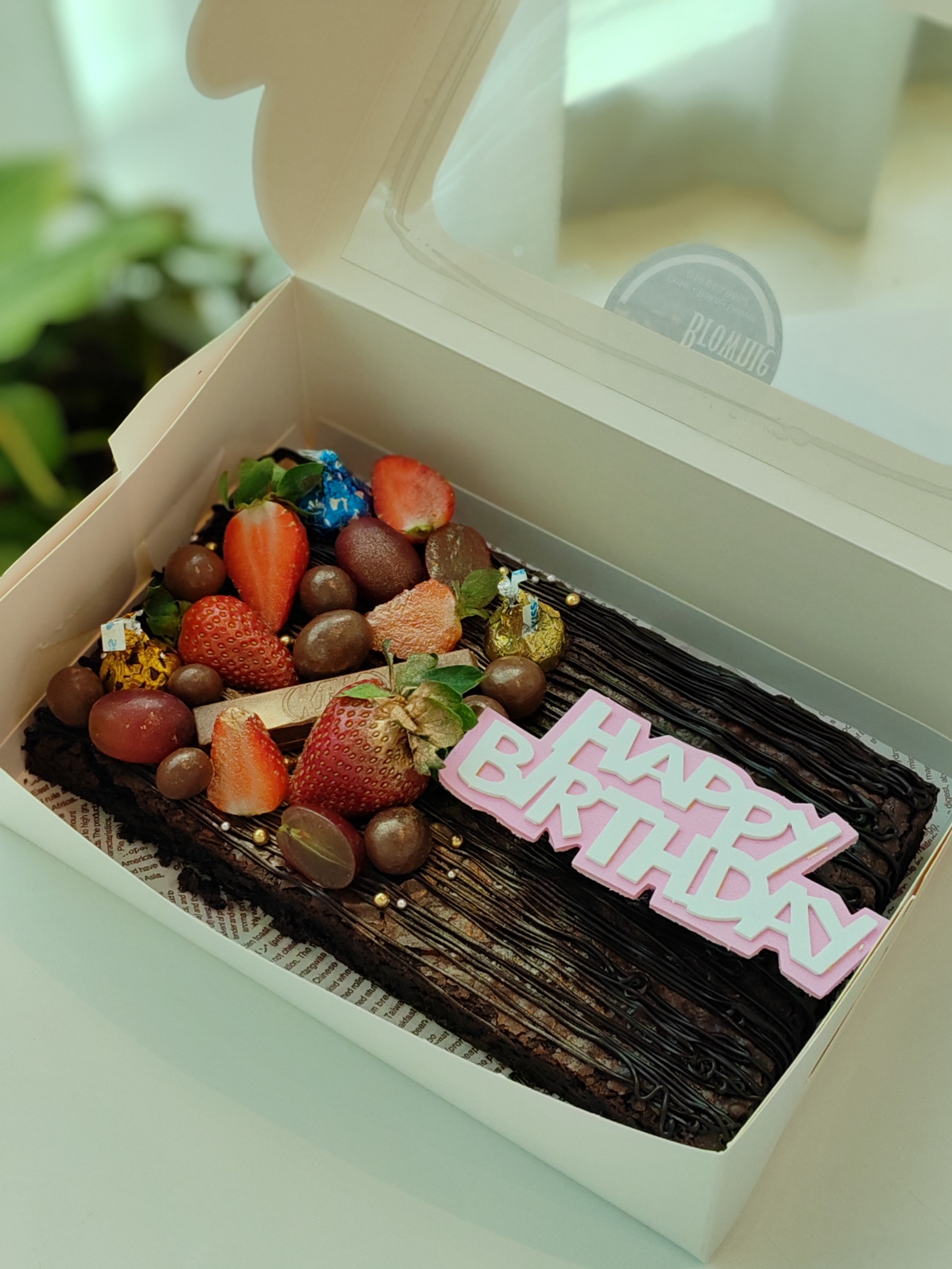 Rich, fudgy double chocolate brownie topped with fresh strawberries, grapes, chocolates, and a stylish *Happy Birthday* topper — the perfect gift to make someone’s day extra special.