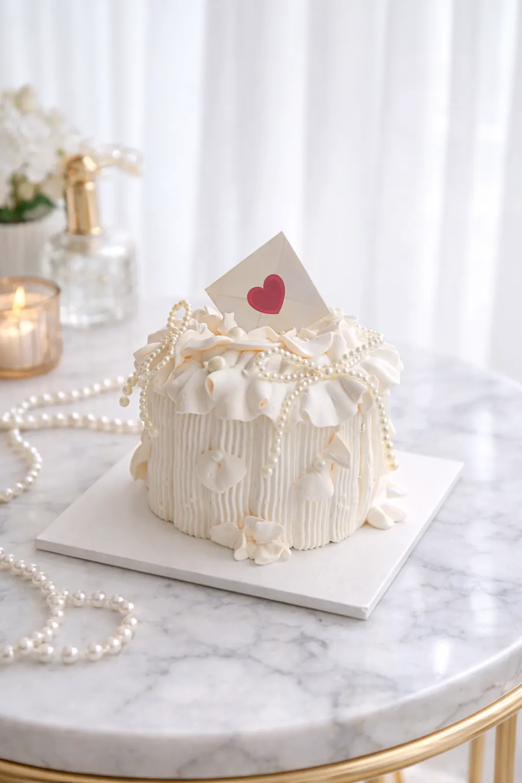 A vintage-romance cake wrapped in delicate ruffled cream, pearl accents, and a sweet love letter topper.