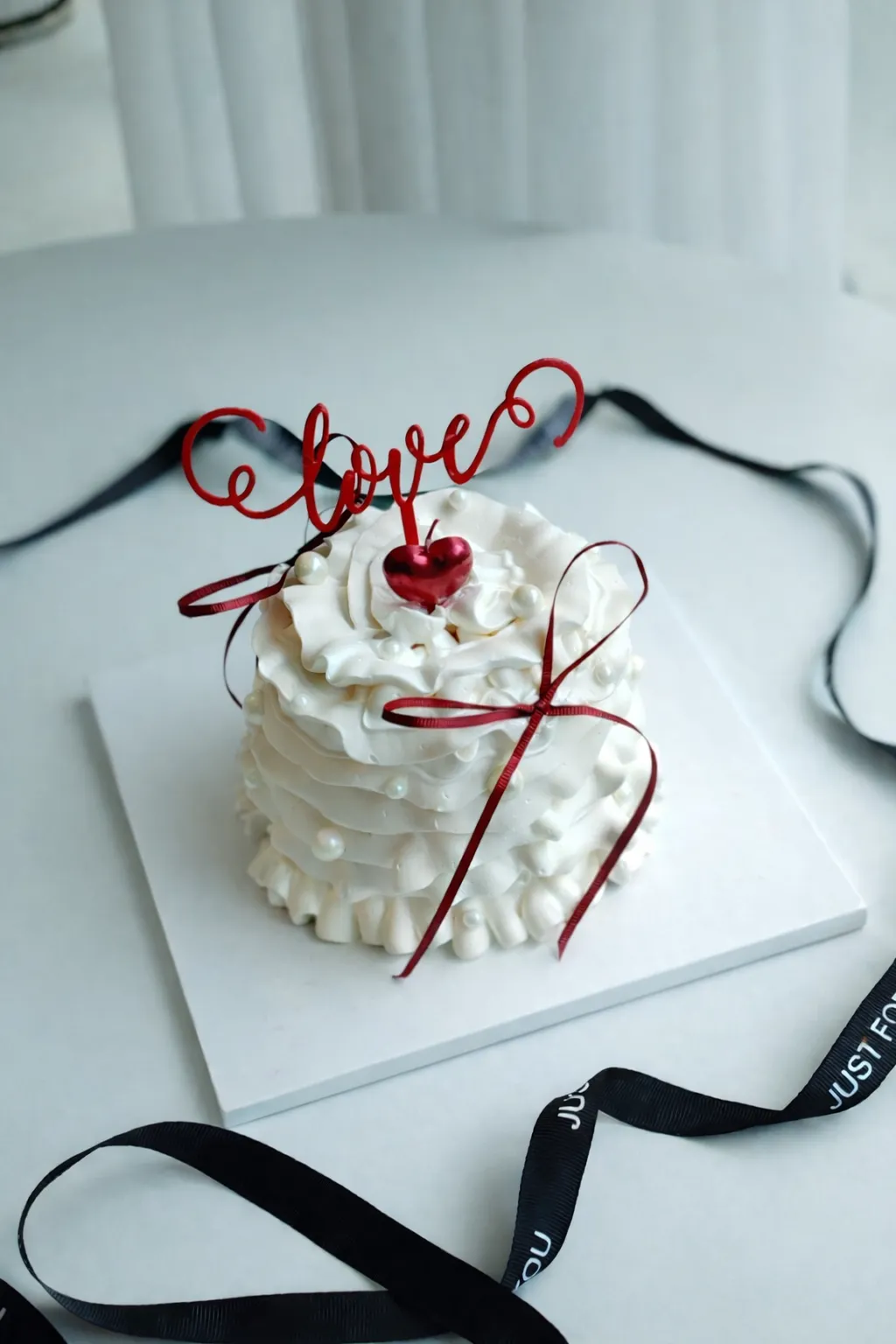 A delicate, cloud-soft white cake wrapped in silky cream ruffles and finished with a ruby-red heart and satin ribbon — a quiet yet powerful expression of love.