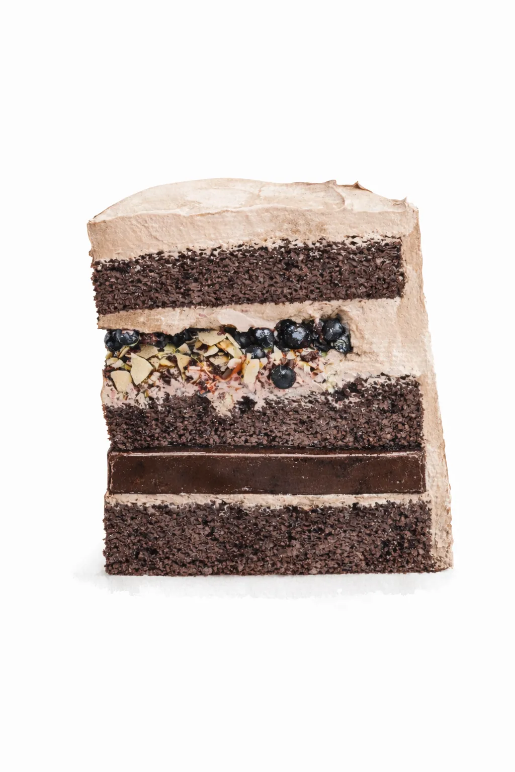 The top layer features crispy butter, crunchy chocolate balls, and brownie cookie crumbs for an elegant texture contrast.